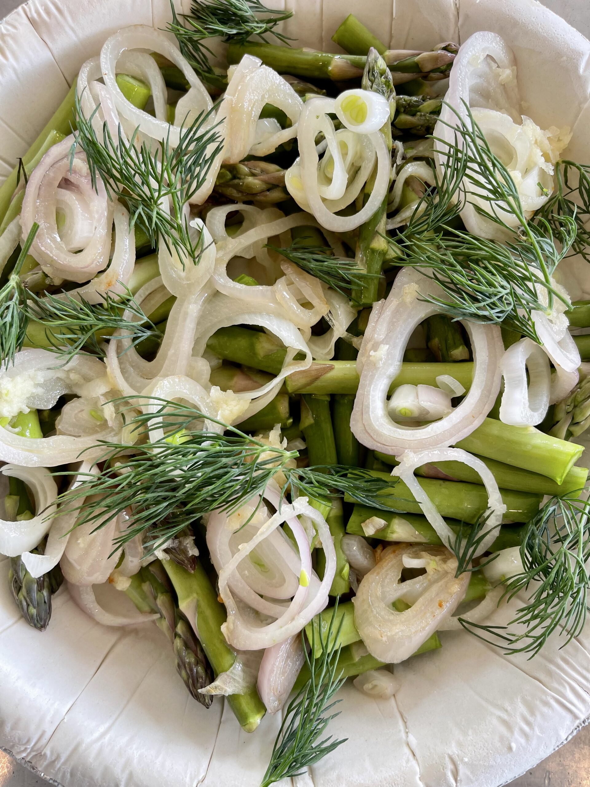 3. Cut 2 inches off the ends of the asparagus and discard. Cut the asparagus into 2 inches pieces and place in your prepared pie crust. Add in the sauted shallots and garlic – spread around to evenly distribute. Repeat with the dill.