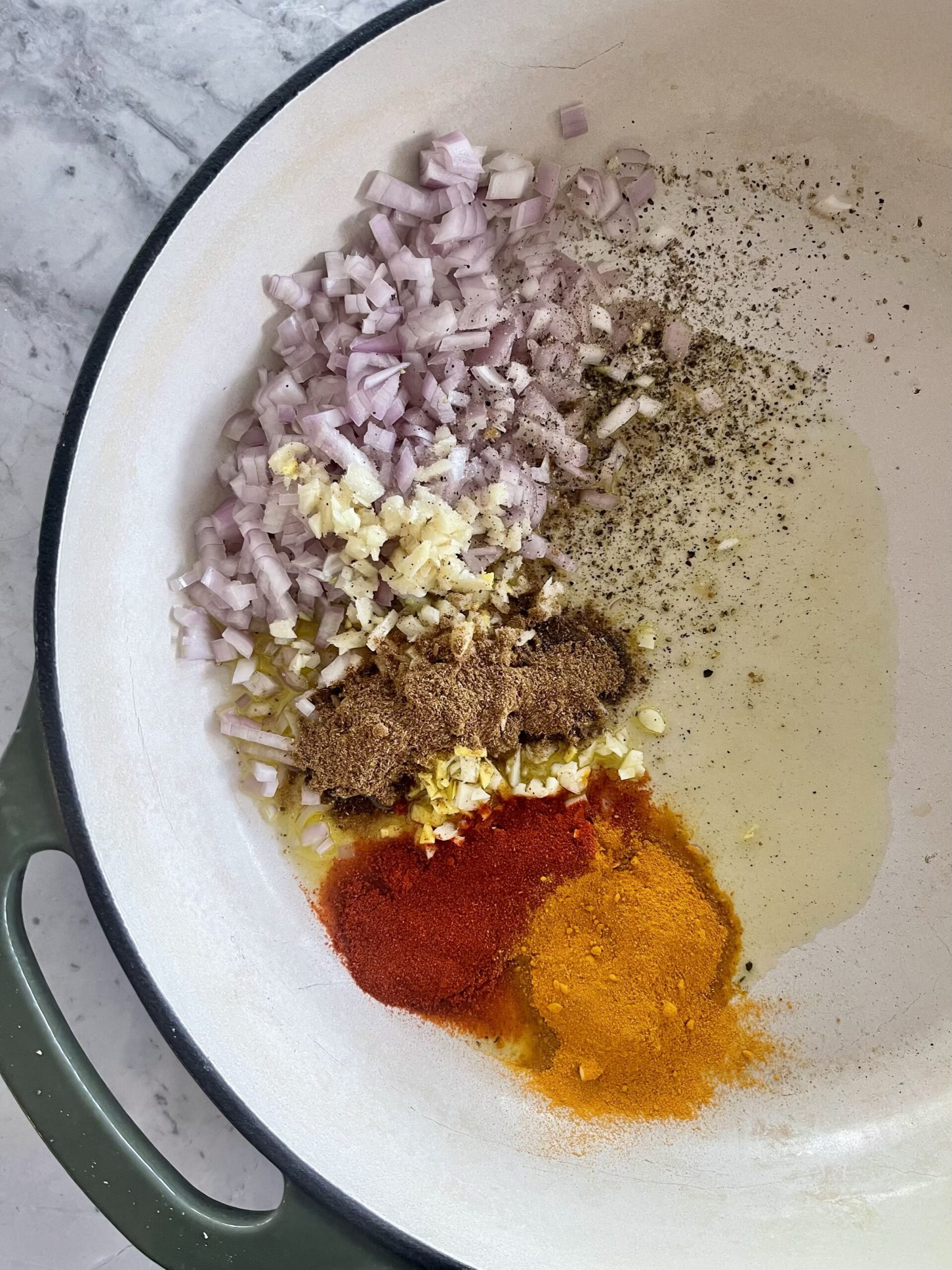 - In a medium to large saute pan (large enough to hold all the chicken, carrots* and sauce) saute the olive oil, shallot, garlic, ginger, coriander, garam masala, turmeric, smoked paprika and salt and pepper over medium heat. Cook while stirring occasionally for 4-6 minutes or until the shallots are softened.