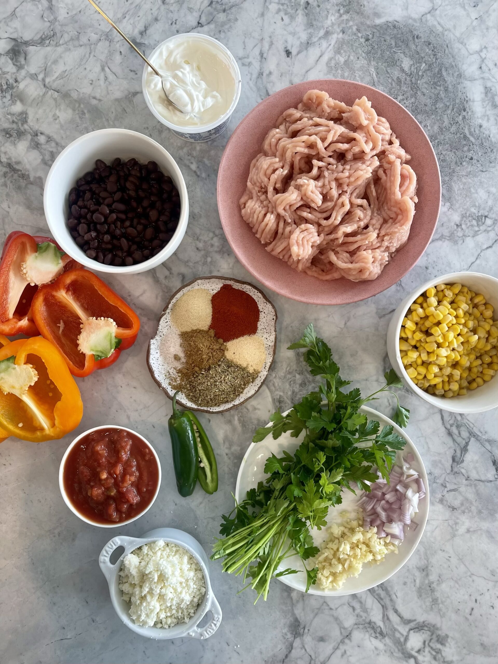 Ground chicken. Garlic. Shallots. Bell peppers. Black beans. Corn. Salsa. My signature spice blend. Finished with cilantro and cheese.